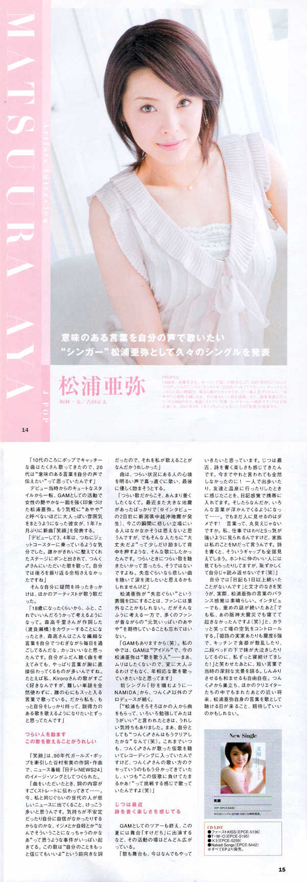 - つんく♂プロデュースのポップ・アイドル路線から脱皮し、ひとりのアーティストとしてしっとりとした大人の曲を歌い、でもアイドルとしてはユニット「GAM」で弾ける──そんな決意をした繊細な時期の「あやや」こと松浦亜弥さんへの2007年7月のインタビューです。